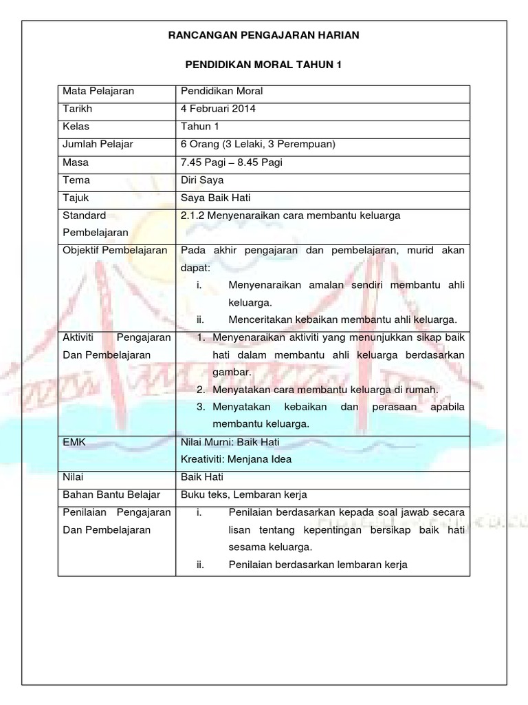 Contoh Rph Tahun 1 Pendidikan Moral